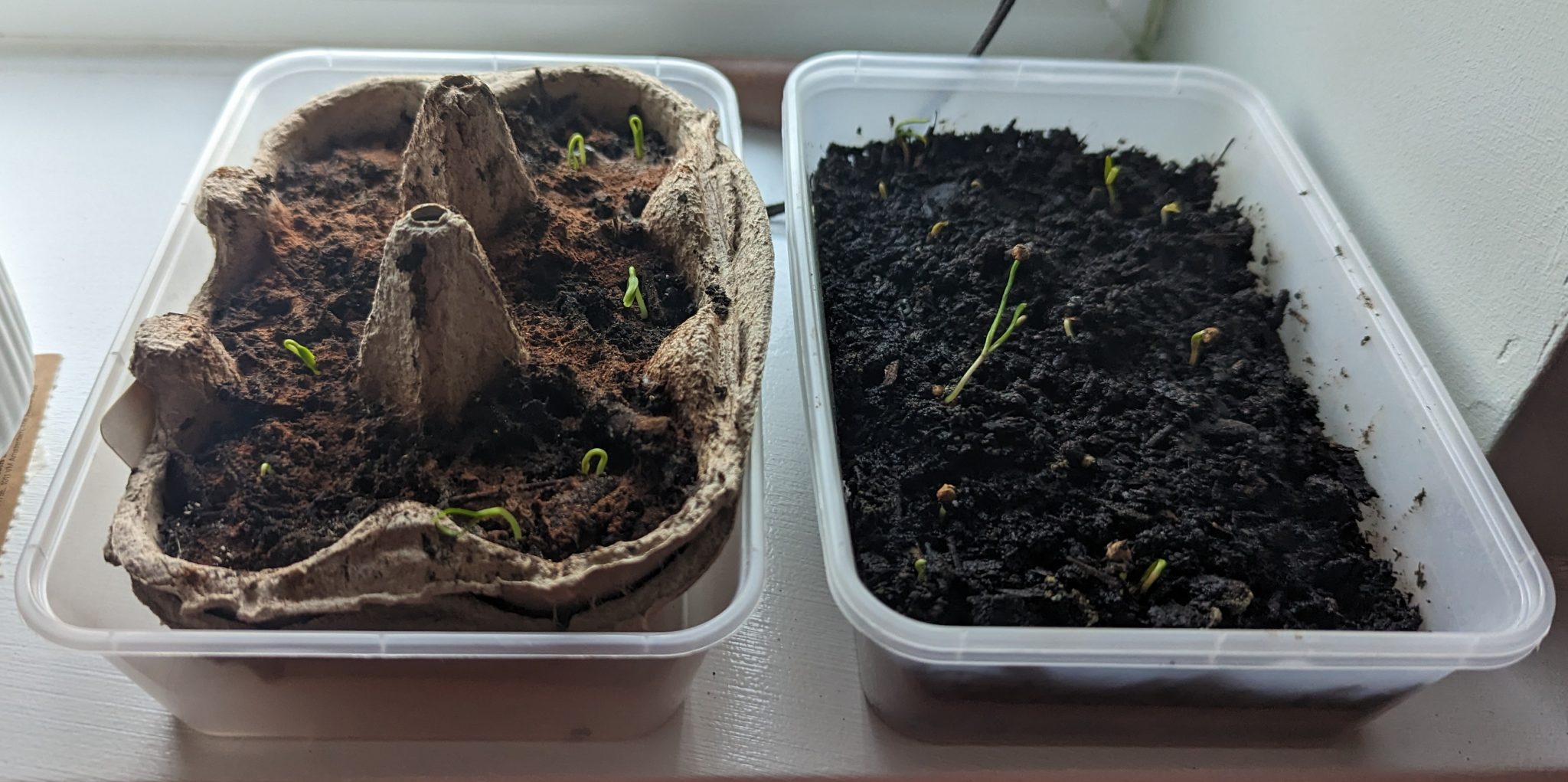 It doesn’t matter when you want to start getting into growing your own food, there is always a seed that can be sown. You don’t need much to start seeds – small containers (you can sometimes find these being given away for free or can be purchased cheaply), compost and seeds (plus time, patience and not too much water). You can also grow in plastic take away containers with added drainage holes as well as cardboard egg boxes/toilet roll tubes.