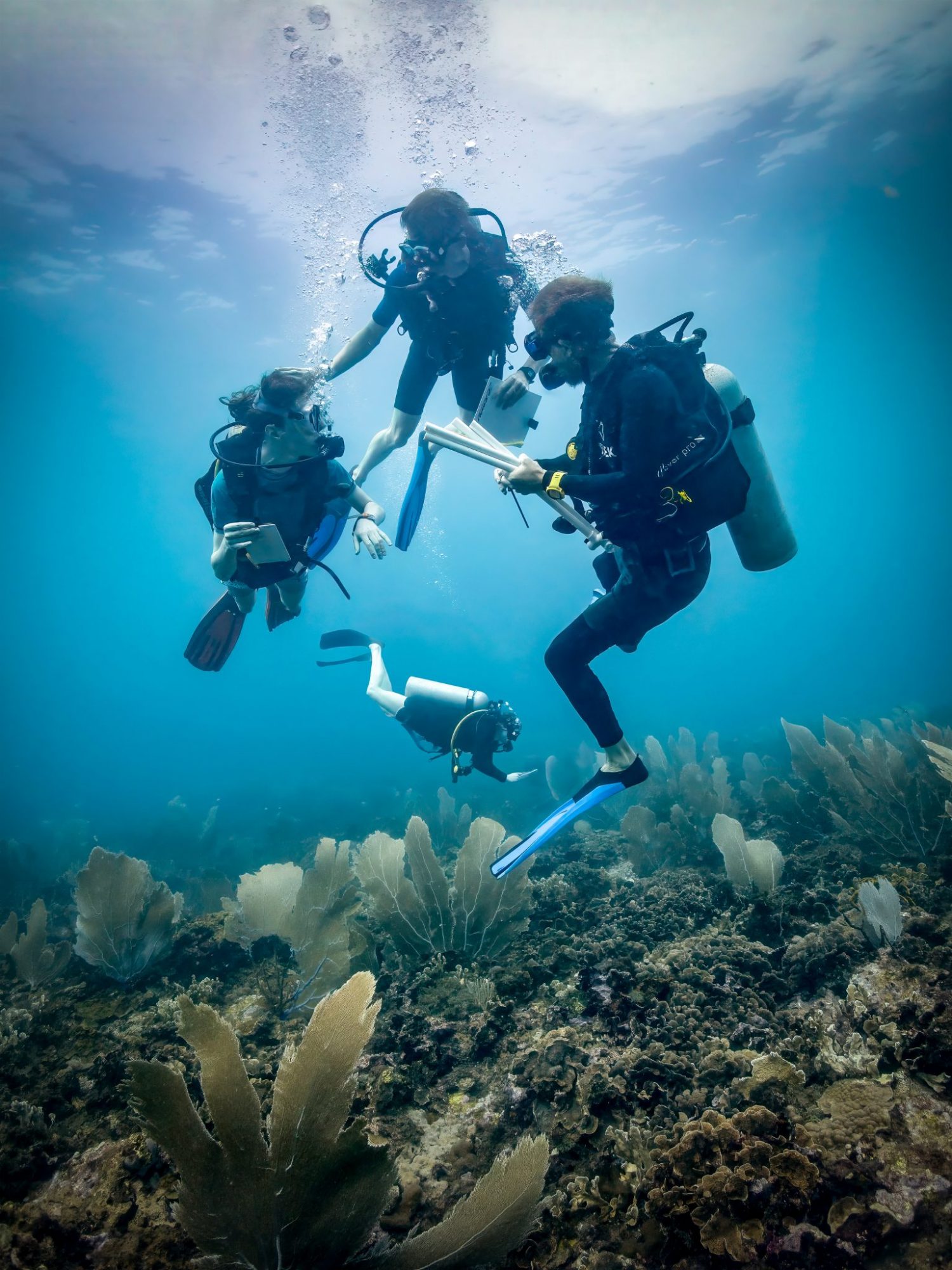 This was taken in Tela Bay, Honduras in 2025. It shows our site manager and project lead (Rowan, on the right) with his three research assistants – all equipped with slates and pencils. They’re on a Reef Ecology dive, spotting, identifying and recording different marine species. The PVC pipes Rowan is carrying form a quadrat which is used while surveying an area of seabed.