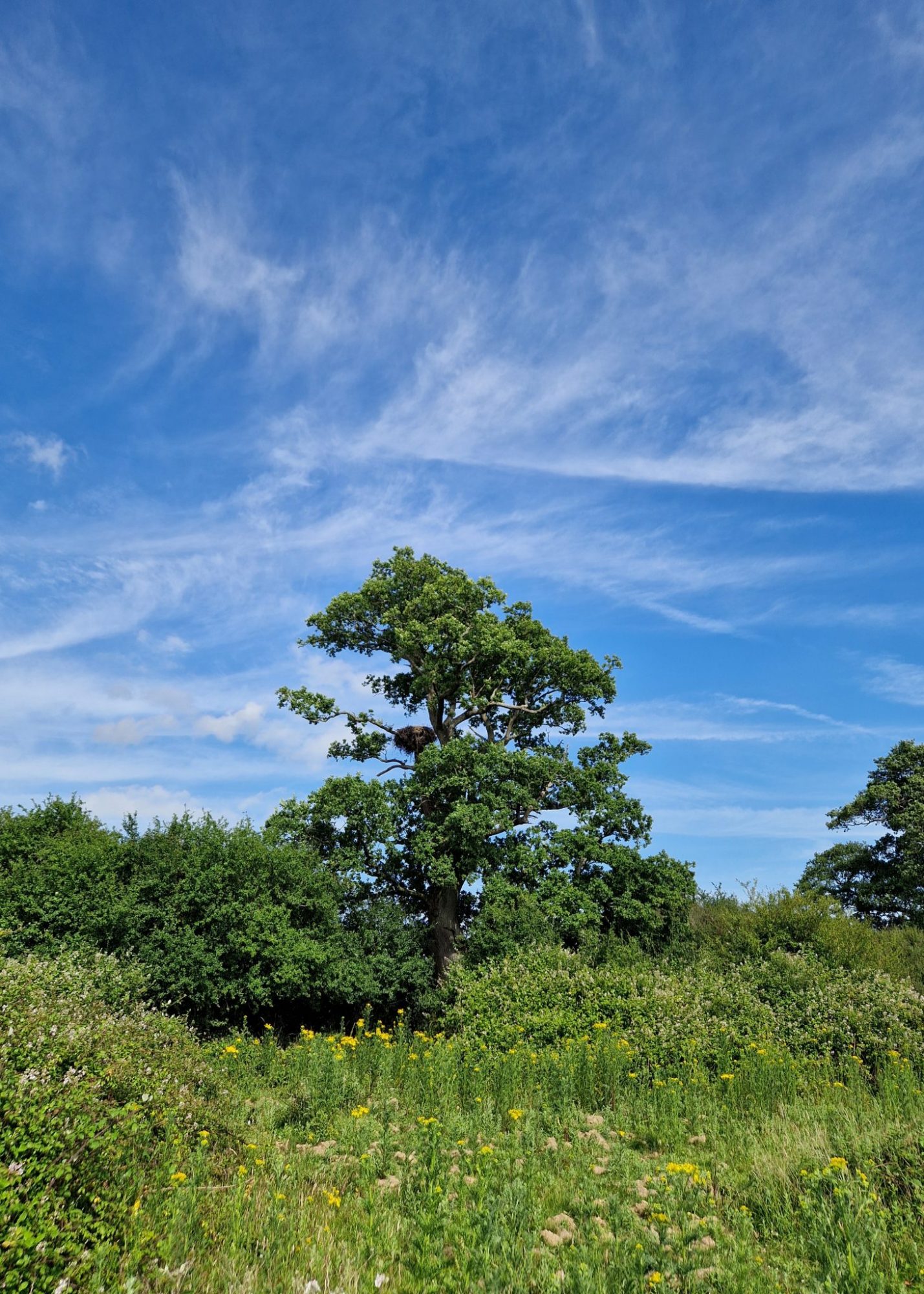 The second photo is of a huge white storks nest in an oak tree, above an old hedge that has been allowed to spread out and scrub up as part of Knepp’s rewilding process.