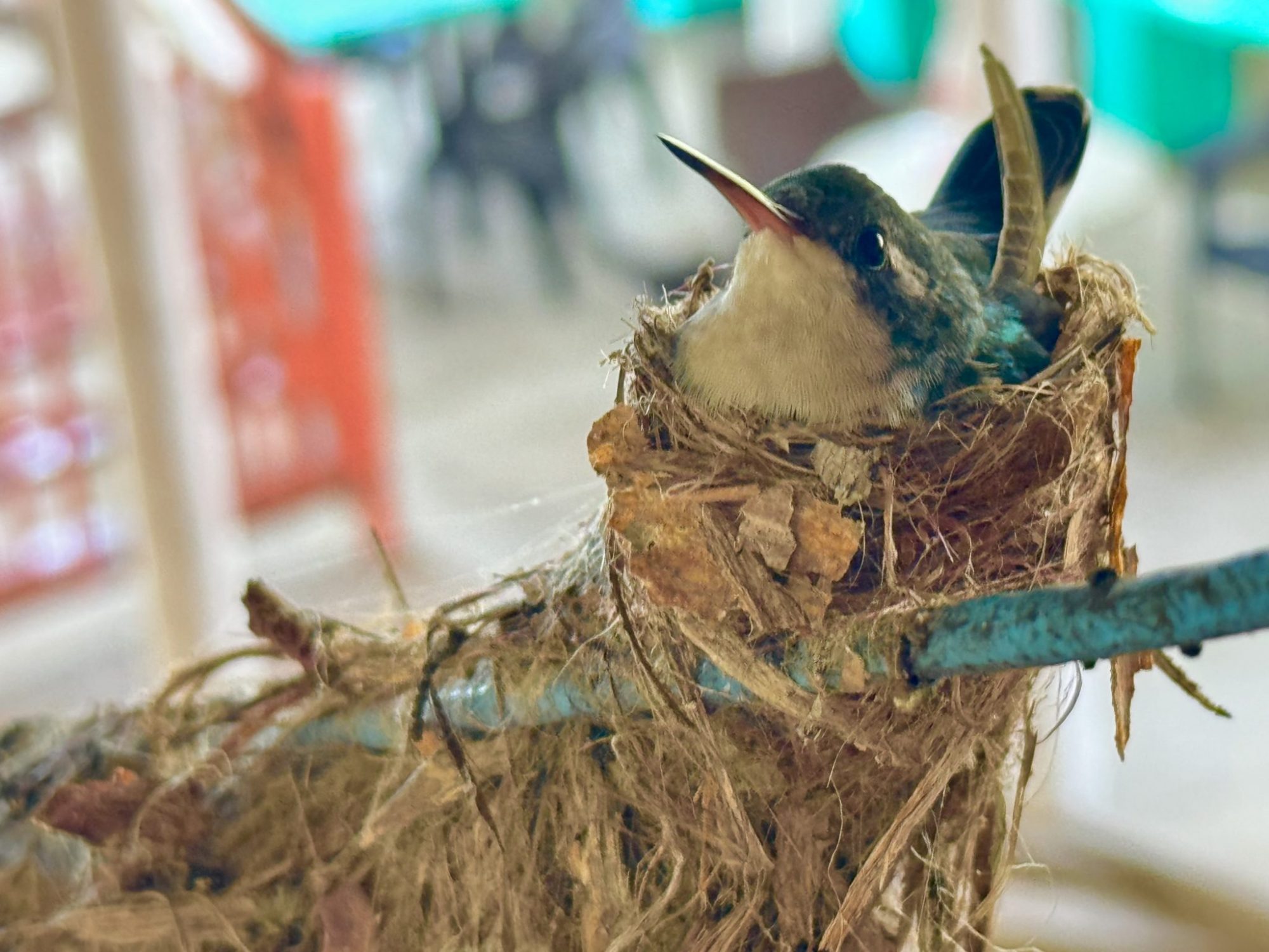 A picture of a blue-tailed emerald hummingbird nesting on what I believe is a telecommunications wire in the hotel my school group was staying at in Utila.