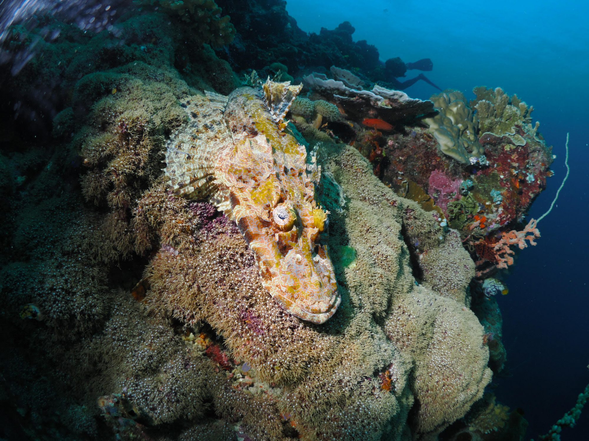 A well camouflaged crocodile fish resting on the reef, blending seamlessly into its environment.