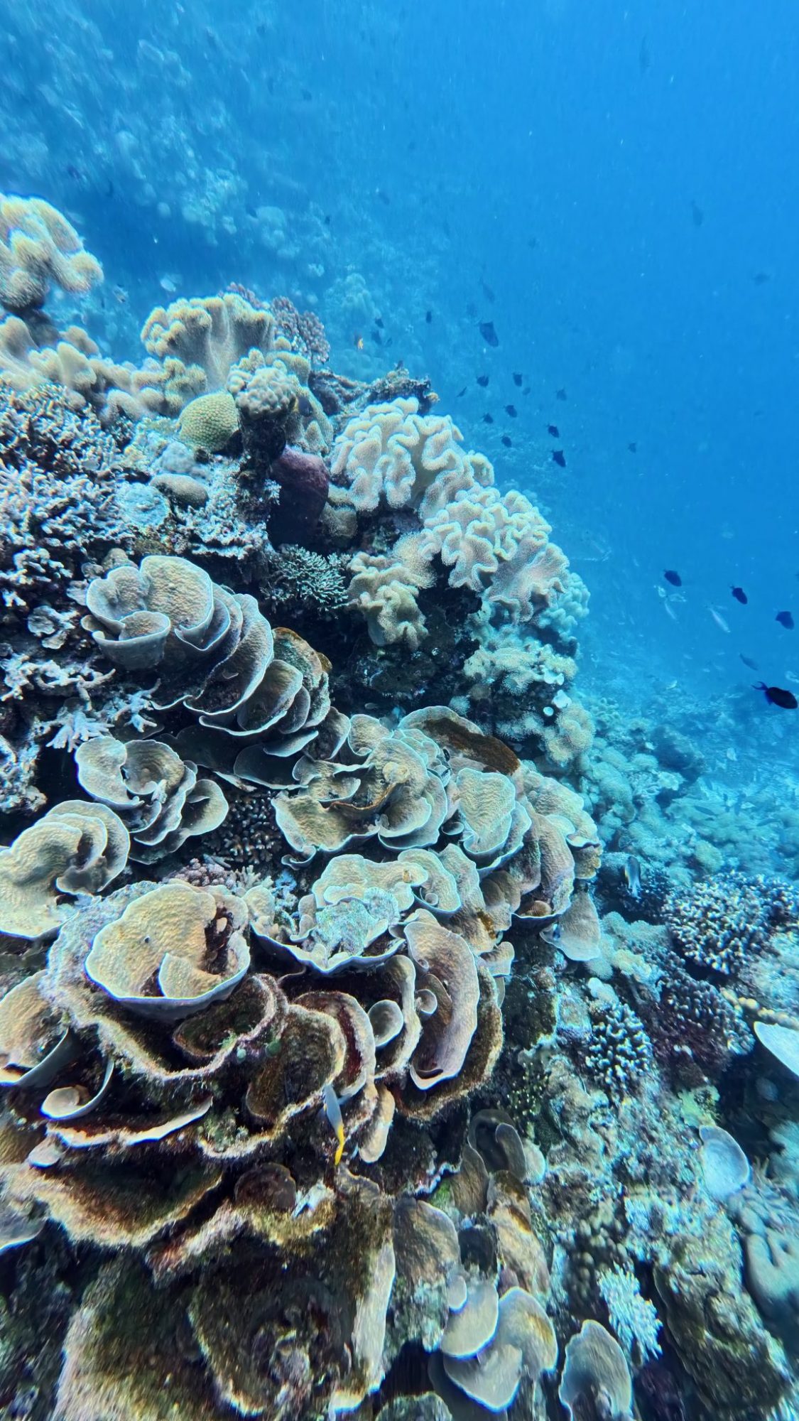 Picture of corals with a school of midnight triggerfish swimming past around Hoga island on one of the coral ID surveys.