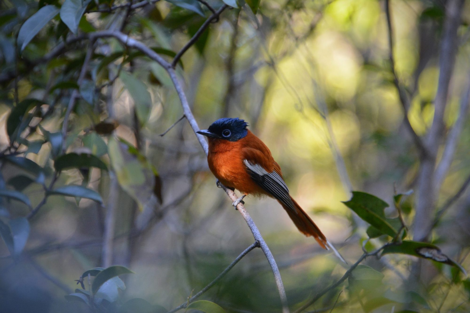 2. A vividly colored “Madagascar paradise flycatcher” perches on a slender branch, its bright red body and dark head standing out against the softly blurred green background.