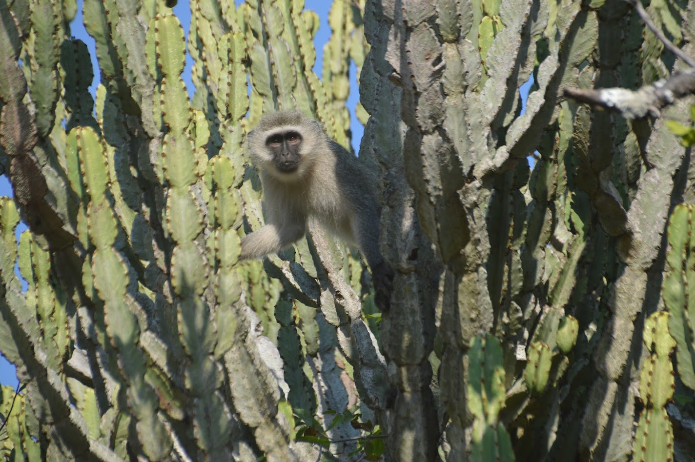 This is a photo of a monkey hanging about in the beautiful cactus awaiting his next feed from our campsite scraps