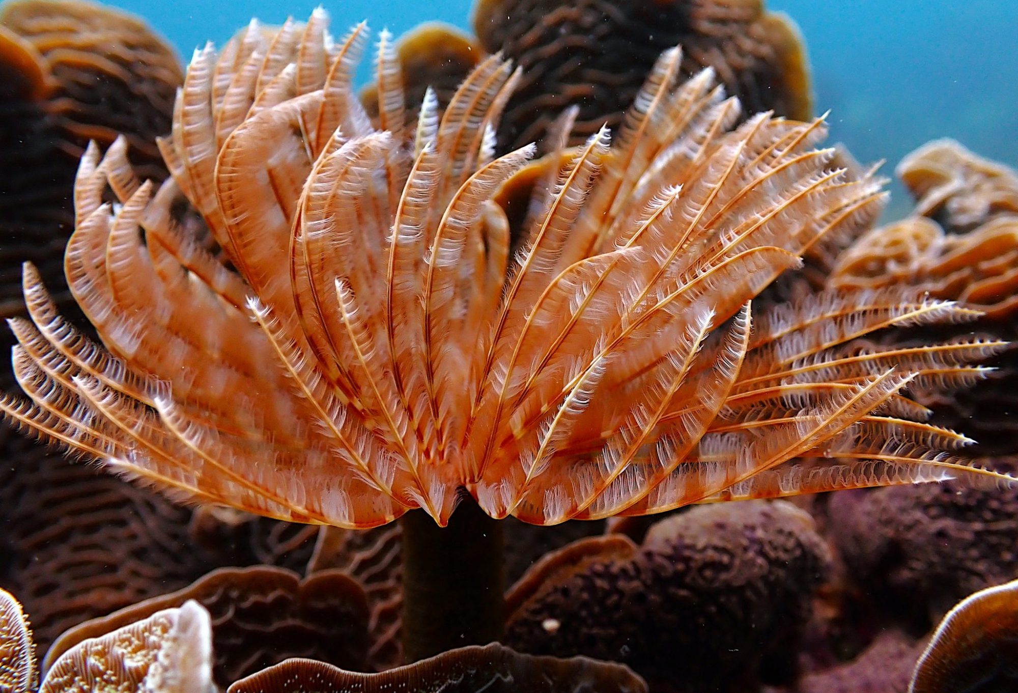 A feather worm with its fronds fully extended amongst Agaracia agaracites coral.
