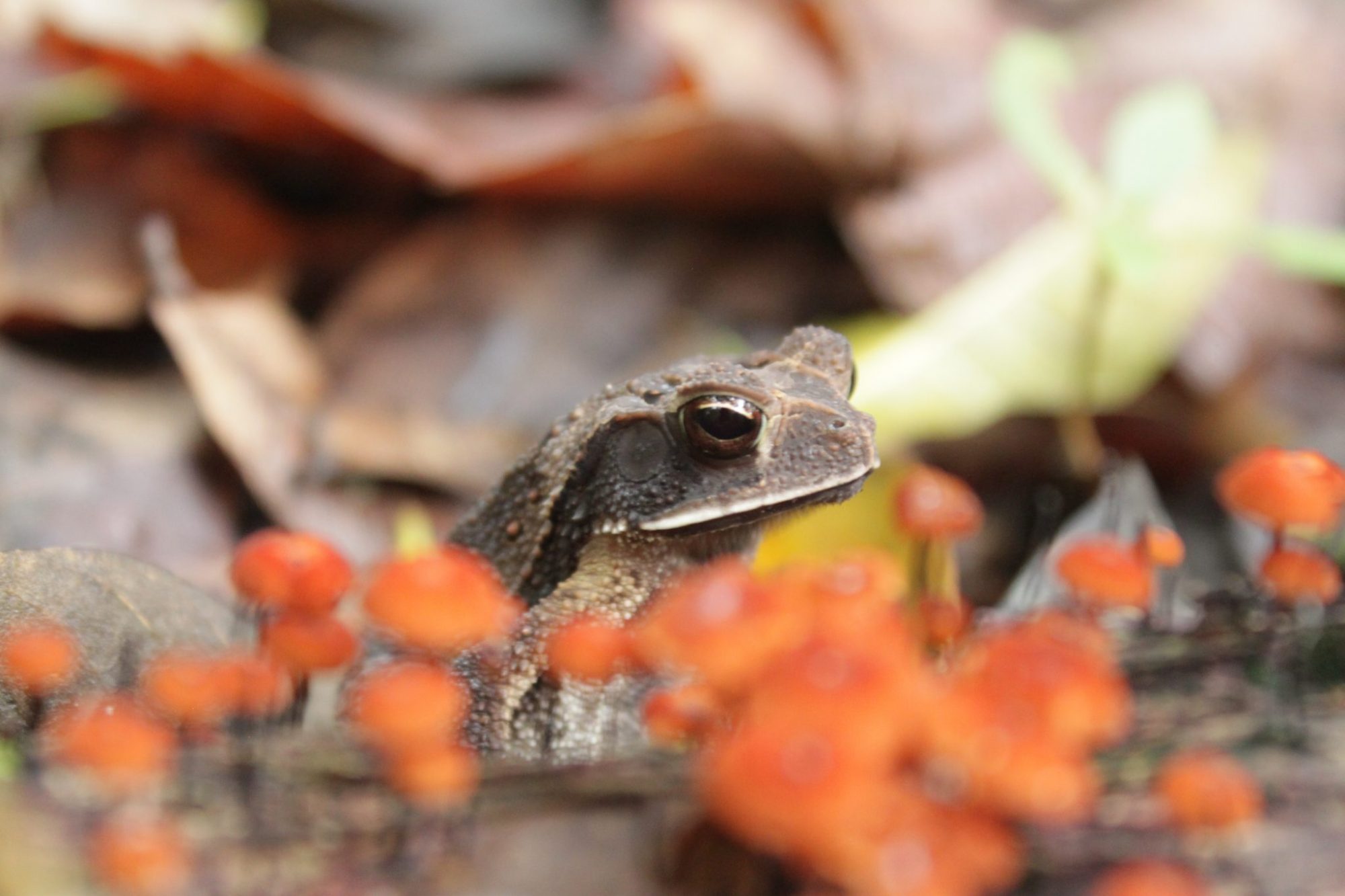 Both of the pictures entered are of gulf coast toads. Whilst these amphibians are a common encounter both in camp and on transect in the Calakmul Biosphere reserve, they are never less full of personality and (in my opinion) charisma! In one image you can see a particularly friendly individual who was happy to pose to have their picture taken, and in the other you can see another, more shy, individual peeking out from behind a mushroom covered log.