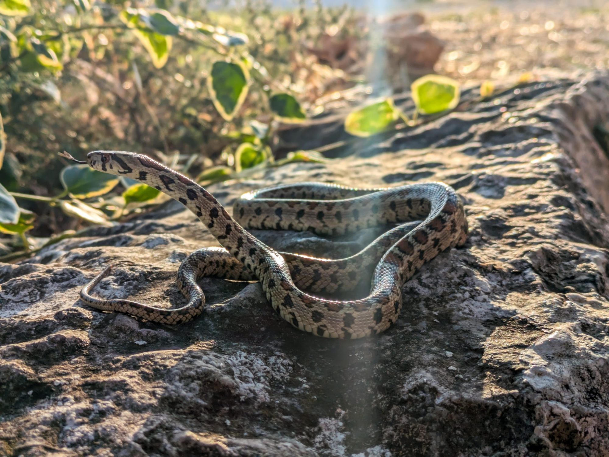 A leopard snake captured during a transect, picture taken during release of the snake after being processed at camp