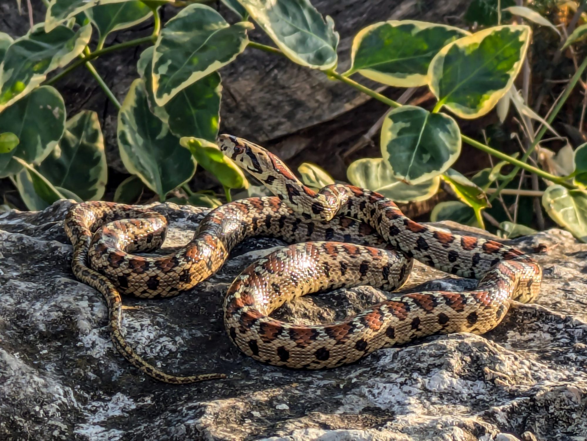 A leopard snake captured during a transect, picture taken during release of the snake after being processed at camp