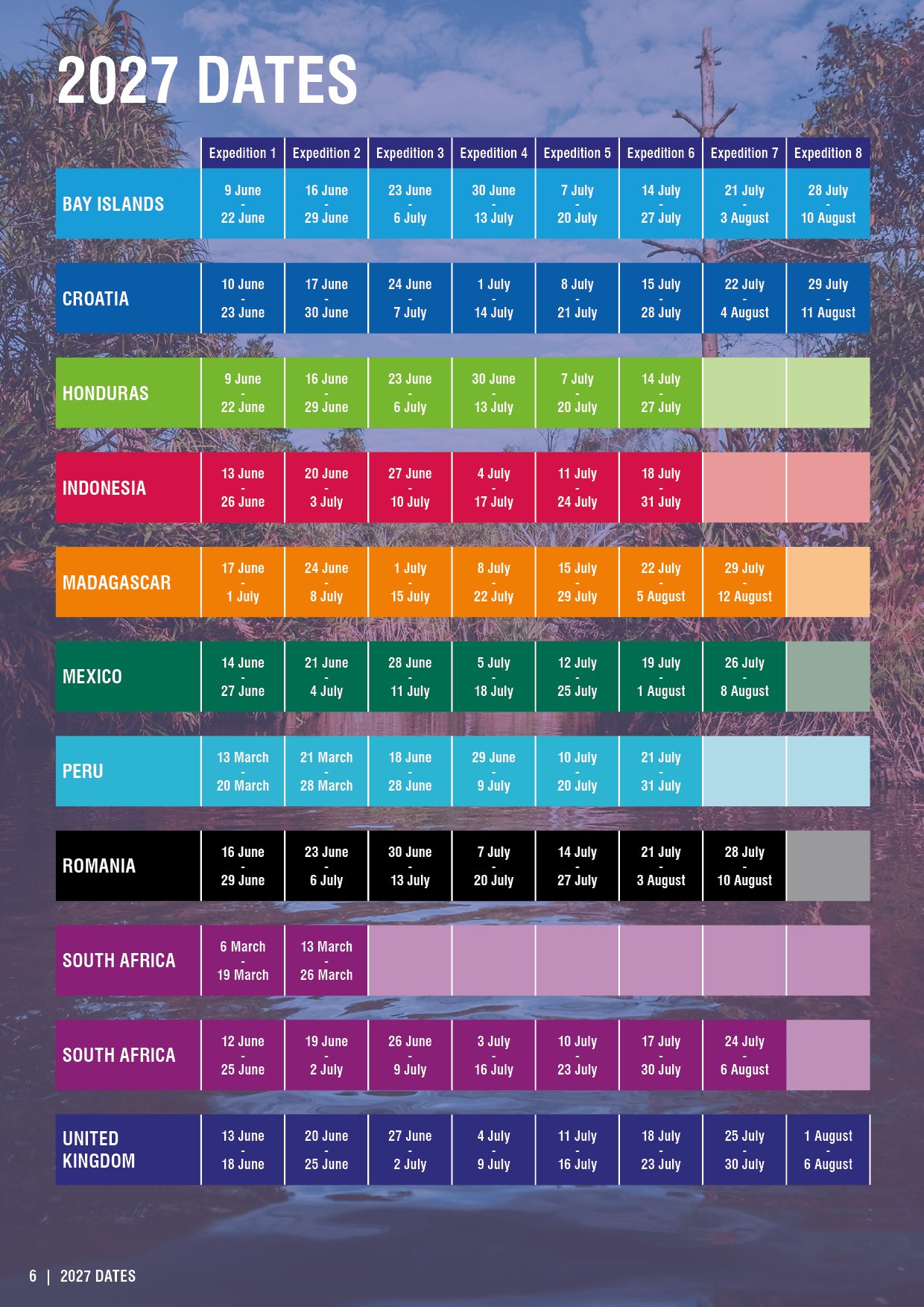 Below you will find the tables of our 2026 & 2027 dates available for school groups. Please contact your nearest Operation Wallacea office for a detailed quote for any of the expeditions of interest to you.